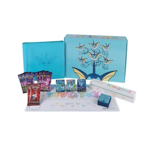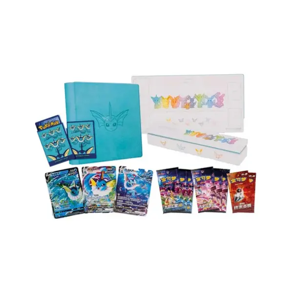Caja con sobres variados y cartas promocionales con temática de Vaporeon