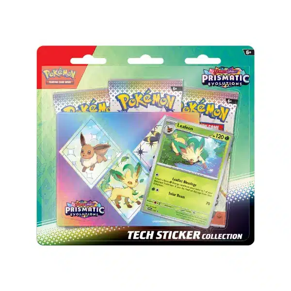 Incluye tres paquetes de mejora de Escarlata y Púrpura-Prismatic Evolution, una carta holográfica de promoción de Leafeon, Glaceon o Sylveon, y una hoja con pegatinas para personalizar portátiles, tabletas y otros dispositivos electrónicos.