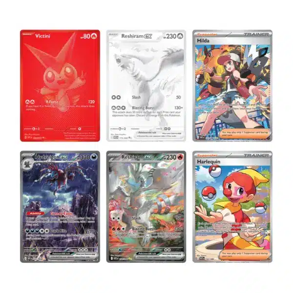 Incluye dos sobres de mejora de Black Bolt, dos sobres de mejora de White Flare, una carta promocional de estilo ilustración rara con Victini.