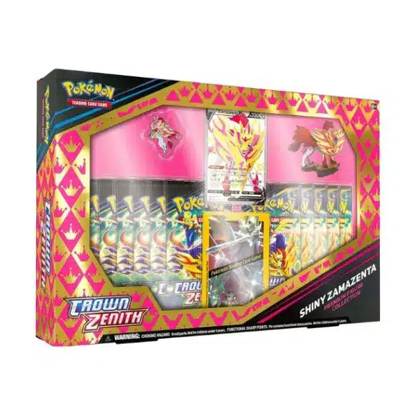 11 Sobres de Crown Zenith, Una carta promo de Zacian/Zamazenta V Shiny, Una figura de Zacian/Zamazenta Shiny, Un pin de Zacian/Zamazenta Shiny, 65 Fundas de Zacian/Zamazenta