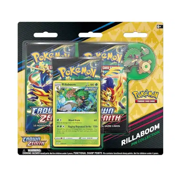 Pin Collection Crown Zenith – Rillaboom, Cinderace o Inteleon. Inlcuye 3 sobres de Crown Zenit, 1 pin y una carta promocional. Modelos son al azar.