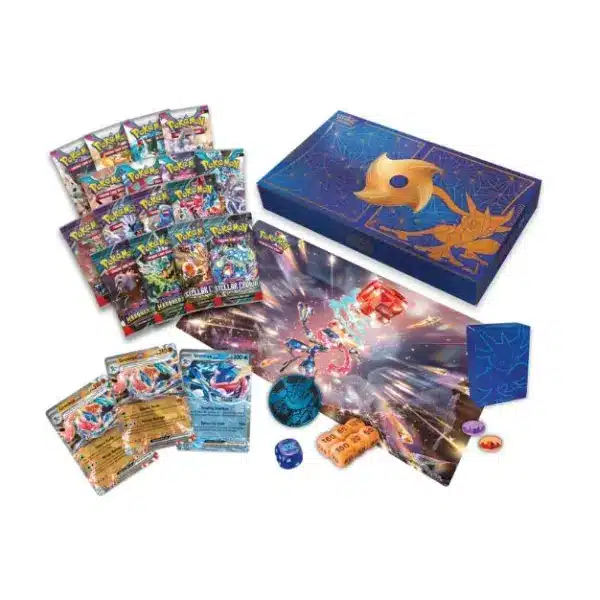 Viene con 16 sobres, una carta de Tera Greninja ex tanto en versión regular como en impresión metálica, una carta de Greninja ex regular, un tapete de juego de goma, una caja para mazo, una moneda metálica, seis dados de contador de daño, dos marcadores de condición de plástico y una carta con código.